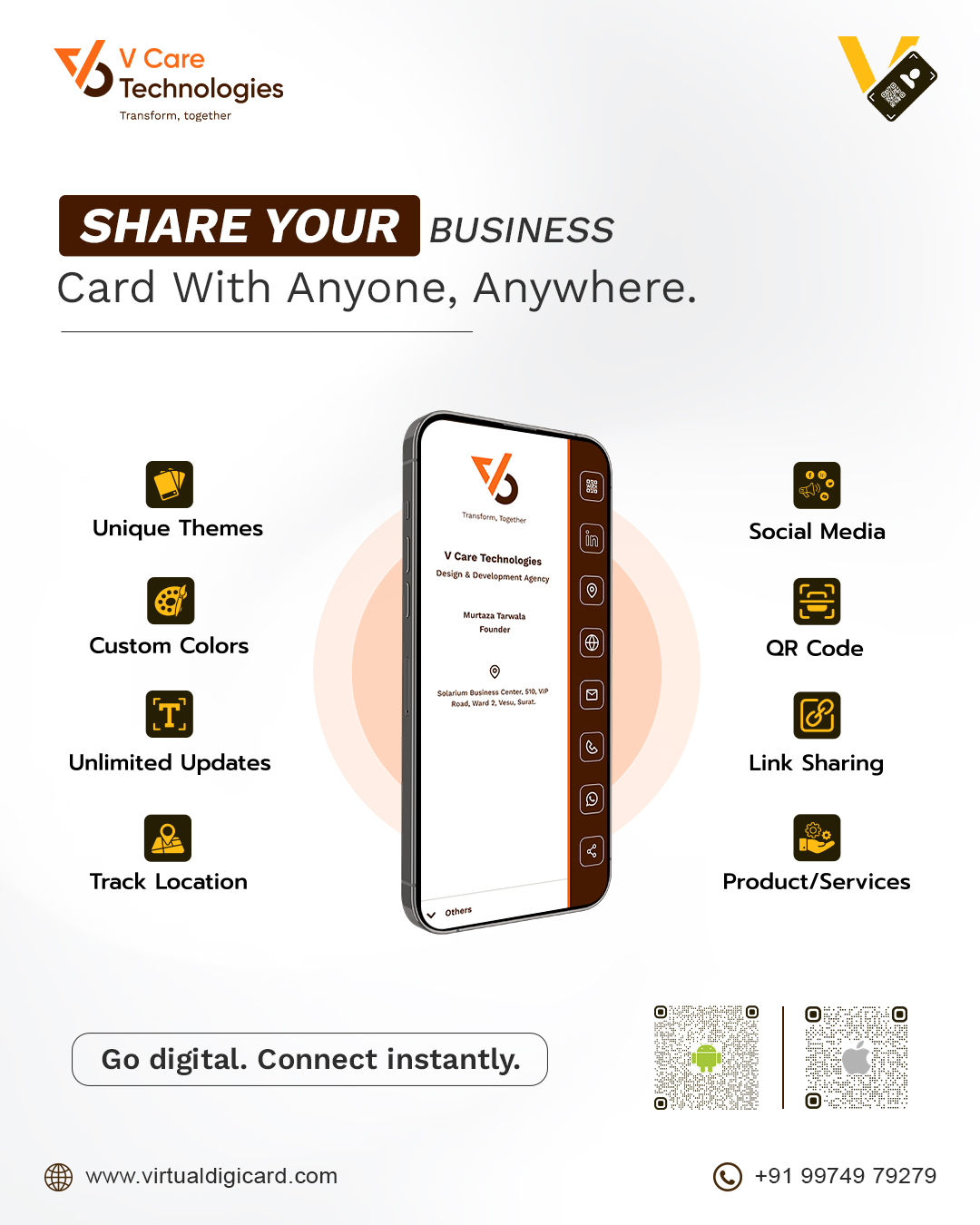 We value our customers as a foundation of our business and pride This text should appear immediately below the H1 to provide context for both users and search engine crawlers. "At V Care Technologies, we transform complex business challenges into simple, scalable digital products. Beyond our custom development services, we offer a suite of specialized SaaS (Software as a Service) products designed to automate your daily operations. Whether you are looking to revolutionize your professional networking with the Virtual DigiCard or gain total transparency over your field force with our Attendance & Location Tracking System, our products are built for efficiency, accuracy, and growth. Explore our ready-to-deploy solutions below and take the next step in your digital transformation."